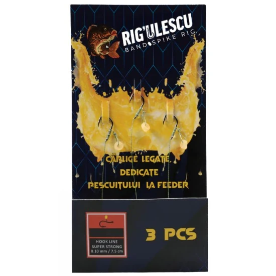 Setul de 3 carlige gata legate Rig’ulescu este gandit pentru a amplifica rata de intepare si a asigura capturi sigure la pescuitul la feeder. Fiecare carlig este legat cu fir textile de culoare kaki, rezistent la abraziune si cu camuflaj excelent, perfect pentru pesti de talie mare.