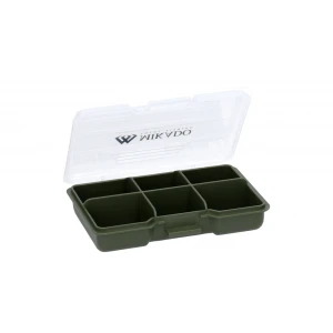 Cutia de accesorii Mikado pentru setul de pescuit la crap, cu 6 compartimente și dimensiunile de 10.5cm x 7cm x 2.5cm, este o piesă esențială pentru organizarea și transportul eficient al echipamentului de pescuit.