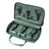 Geanta fabricata din polyester, recomandata pentru depozitarea si transportul buzzbarilor, a rodpodurilor si a avertizoarelor pentru pescuit. Peretii gentii sunt captusiti cu material buretat, iar la exterior geanta este finisata cu un strat din material textil Rip Stop. Fermoarele duble Heavy Duty sunt rezistente la manipulari repetate, iar cheitele metalice atasate de sigurante confera o priza optima in momentul inchiderii sau deschiderii capacului. Geanta este gandita sa poata transporta buzzbari si avertizoare.