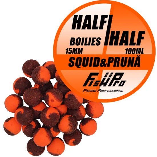 Boilies Fish Pro Half-half, Squid Prune, 15mm, 100ml