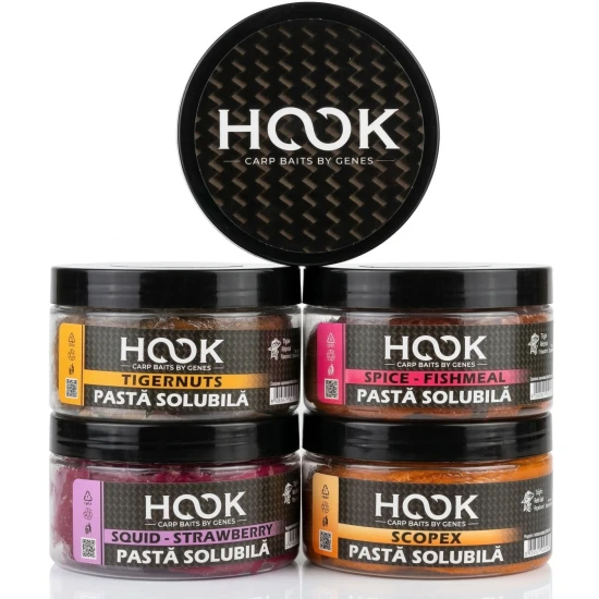 Pasta de boilies solubila Hookbaits este o momeala extrem de atractiva, conceputa pentru a oferi un semnal instant in jurul carligului si pentru a creste rapid sansele de trasatura. Datorita texturii maleabile, aceasta poate fi modelata usor pe orice tip de momeala sau montura, fiind ideala pentru pescuitul la crap in conditii dificile sau pe ape presate.
