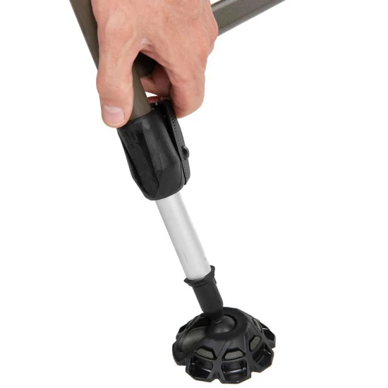 Cele sase picioare reglabile, dotate cu talpi pivotante anti-noroi, asigura stabilitate maxima pe orice tip de teren. Noul sistem de reglaj rapid cu arc (one-touch) permite ajustarea usoara a inaltimii, iar balamalele duble si curelele laterale de tensionare faciliteaza o pliere compacta si sigura pentru transport.