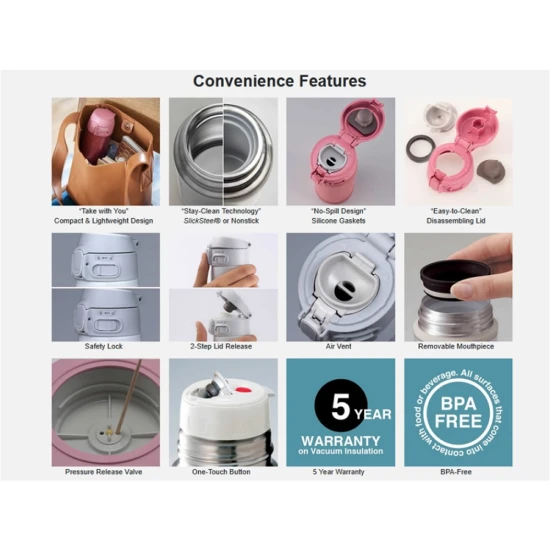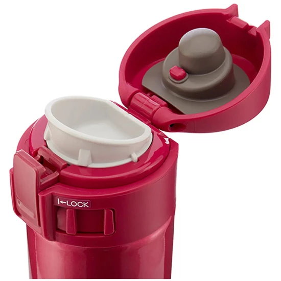 Atasamentul din plastic de pe gat protejeaza pielea delicata a buzelor de arsuri atunci cand bei bauturi fierbinti. Capacul are un buton care poate fi identificat intuitiv cu degetul mare, permitand deschiderea si inchiderea termosului cu o singura mana. Blocatorul — o incuietoare speciala — previne deschiderea accidentala in timpul transportului.